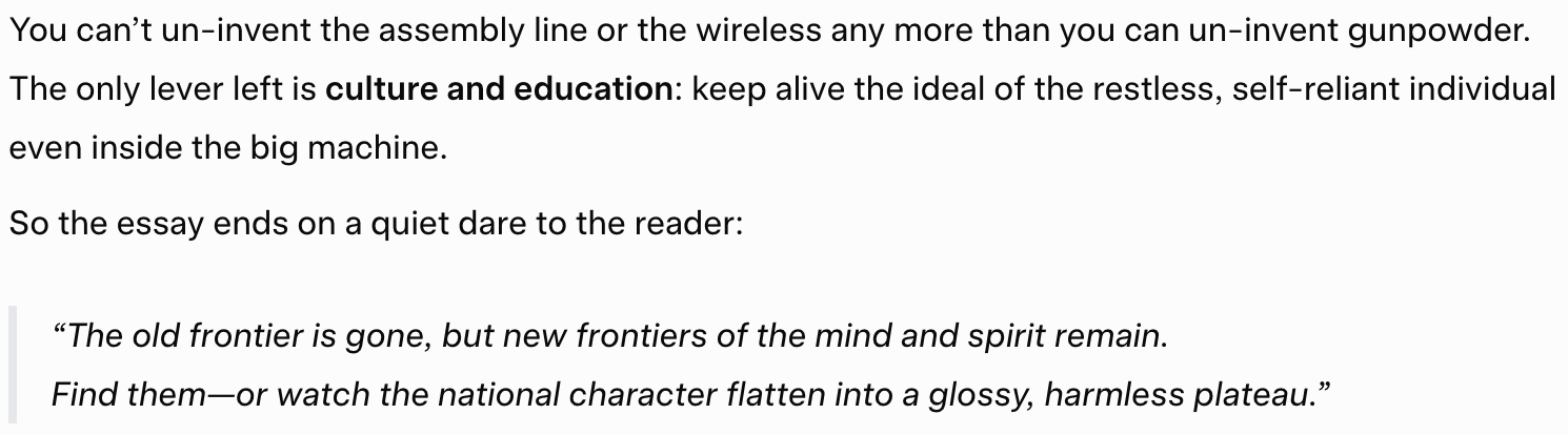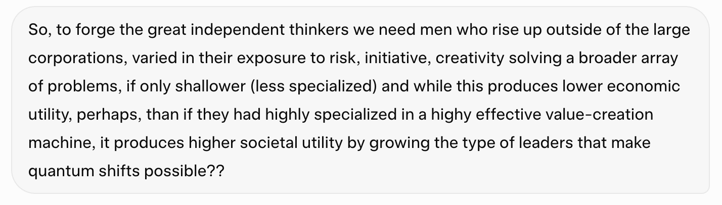 People in larger corporations might advance in a linear, predictable way—climbing ladders, following protocols—but it's slower or shallower in developing those rugged, adaptive traits because risks are minimized, decisions are delegated upward, and creativity is channeled into narrow roles. Society as a whole progresses materially (e.g., abundant goods, widespread knowledge via media), but the individual's inner development lags, leading to a more uniform, less heroic populace.